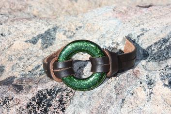 Full Fused Iridized Green Ring Bracelet W/Dark Brown Leather Strap - $48.00