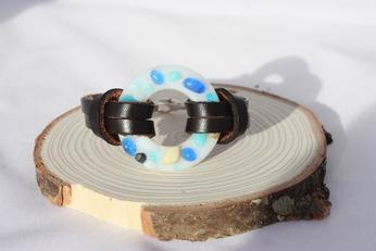 Tack Fused Blue & White Ring Bracelet w/ Espresso Leather Strap - $48.00