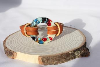Tack Fused Reds, Creams & Blues Ring Bracelet w/ Tan Leather Strap - 48.00