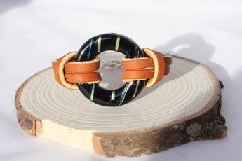 Full Fused Black w/ Dichroic Stringers Ring Bracelet w/ Tan Leather Strap - $48.00