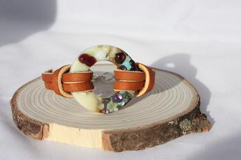 Tack Fused Cranberry & Cream Ring Bracelet w/ Tan Leather Strap - $48.00
