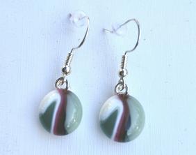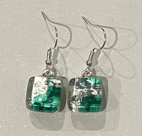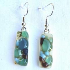 1 X 3/8” Tack Fused Green, Blue Brown & Cream Earrings w/Silver Plated, Nickel Free Findings - $25.00