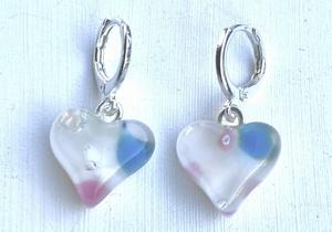 11/2" x 1/2"Full fused Pink, White and Blue Hand Cut Heart Earrings w/ Silver Plated, Nickel Free Findings - $25.00