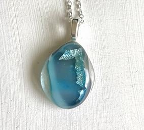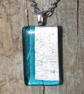 1 ¾” X 1” Full Fused Aqua and Silver Pendant w/ 18” Figure Eight Chain - $28.00