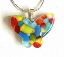 1” X 1½” Full Fused, Hand Cut Butterfly Pendant. Multi Color w/ 18” Silver Plated Chain - $42.00