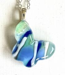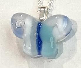 3/4" x 3/4" Full Fused, Hand Cut Mini Butterfly Pendant. Multi Blues and White w/ 18” Silver Plated Chain - $28.00