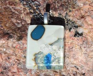 Full Fused Cream, Blue & Silver Pendant 1 1/2" x 1 1/4" w/silver plated finding & 18" Figure Eight Chain - $28.00