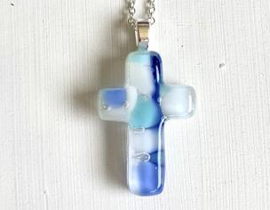 1” X3/4” Full Fused, Hand Cut Mini Cross. Blues and White Pendant w/ 18” Silver Plated Chain - $22.00