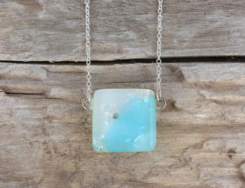 1 1/4” x 1" Full Fused, Hand Cut Aqua Pendant w/ 18” Chain - $28.00