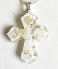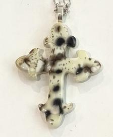 2” X 1 1/2” Full Fused, Hand Cut Cross. White with Gold Flecks w/18” Silver Plated Chain – $42.00