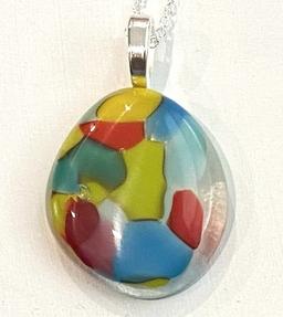 1 1/4" x 1" Full Fused, Hand Cut Fiesta Confetti Pendant with 18" Silver Plated Chain - $28.00