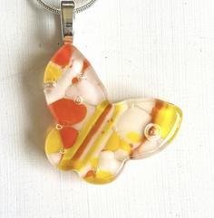 1" X 1 ½” Full Fused, Hand Cut Butterfly Pendant. Orange, Yellow and White w/ 18” Silver Plated Chain - $42.00